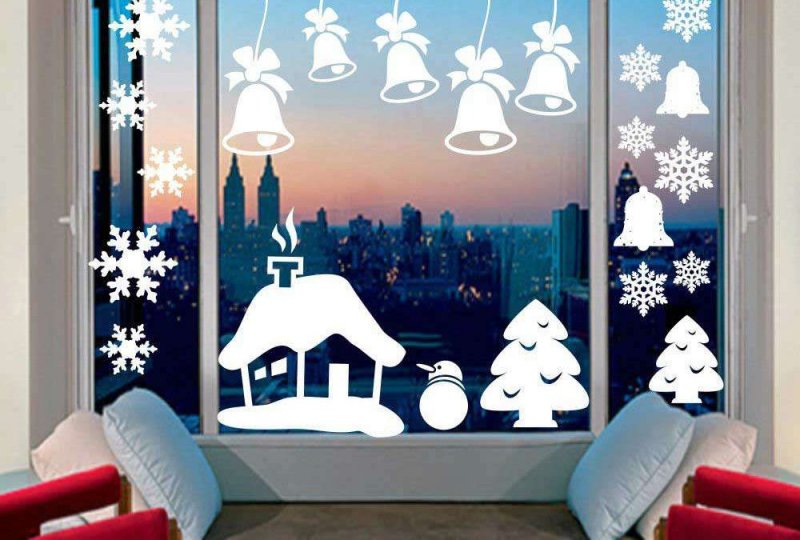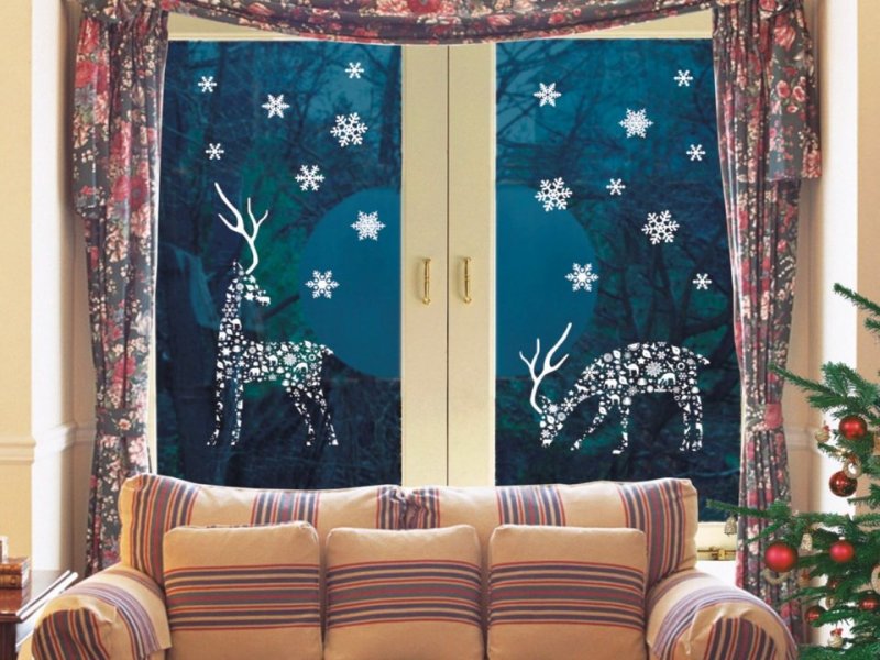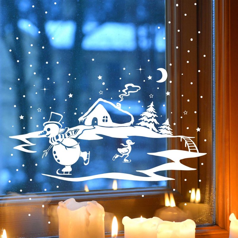 К Рождеству, Новому году окошки украшают бумажными снежинками, снеговиками, фигурками Деда Мороза, елочками, целыми сюжетными картинками на зимнюю тематику. Оригинальный декор к новогоднему торжеству: