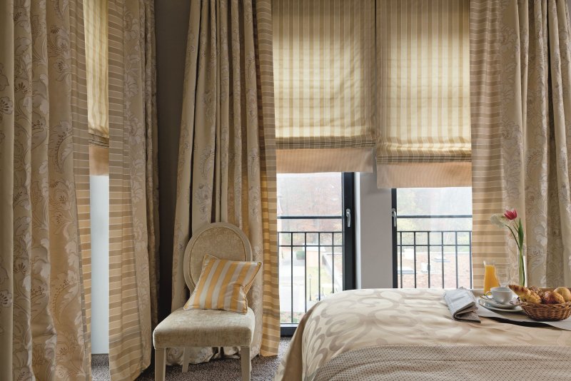 когда на стенах пестрые обои, яркие, многоцветные принты, шторы предпочитаются однотонные, пастельных, нейтральных тонов;