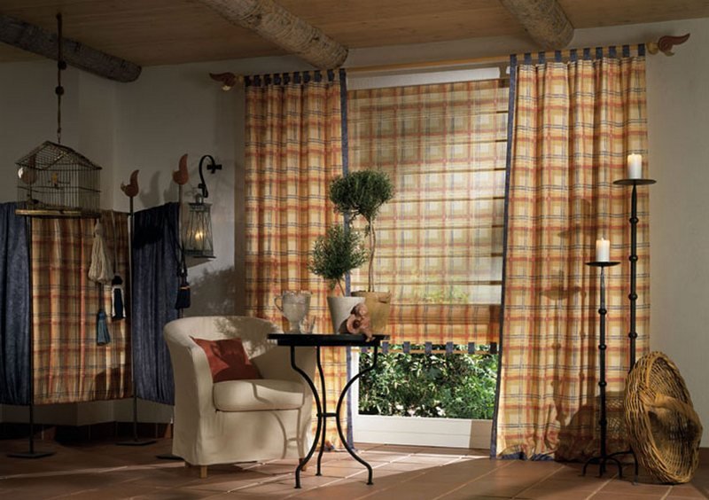 кантри – клетчатые занавески из тонкой шерсти или льна, длиной до подоконника либо пола;