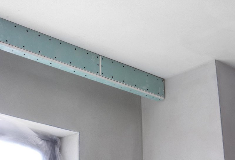 Когда шпаклевка просохнет, все углы тщательно шлифуются мелкой наждачной бумагой, пыль убирается, ниша окрашивается в подходящий колер. Чтобы разнообразить интерьер, еще до установки карниза в нишу монтируют неоновые трубки, галогеновые лампы, светодиодные ленты. С такими деталями комната станет уютнее, а шторы, особенно однотонные, будут «парить» в воздухе. Совет: перед началом обшивки, место, где будет расположен карниз, необходимо разметить, установить закладные, дюбели под него.