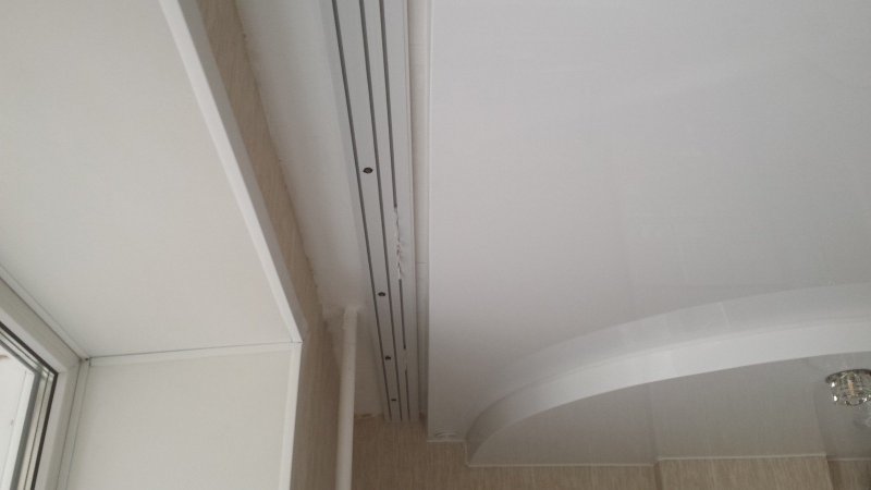 Подвес выполняется в виде шины, монтируемой на потолок в специально сделанной нише – для этого делают каркас. Навесной, натяжной потолок здесь немного не доходит до стены, хотя издали это незаметно. Для натяжных конструкций применяются однорядные, двухрядные, трехрядные карнизы. Они монтируются одновременно с натягиваемым потолком, так как позднее сделать это невозможно. Для гипсокартонных вариантов используются прямые и гибкие изделия, которым придают различную форму – полумесяца, волны и др. Монтирование карниза на навесной потолок также производится в нишу, но установить его можно одновременно с последним либо позднее.