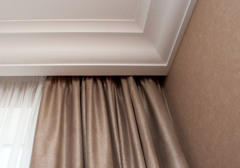 Оформление потолка плинтусом или багетом – оригинальный способ полностью спрятать место стыковки занавески с потолком. Там же часто размещают подсветку – сами лампочки, светодиодные ленты будут незаметны, наблюдатель увидит только их свет. Сама подсветка прячется в нишу, параллельно шторному карнизу, украшая пространство комнаты.
