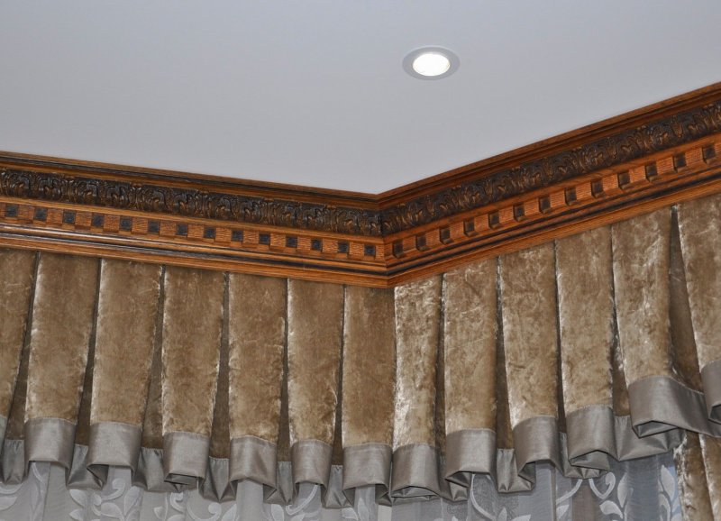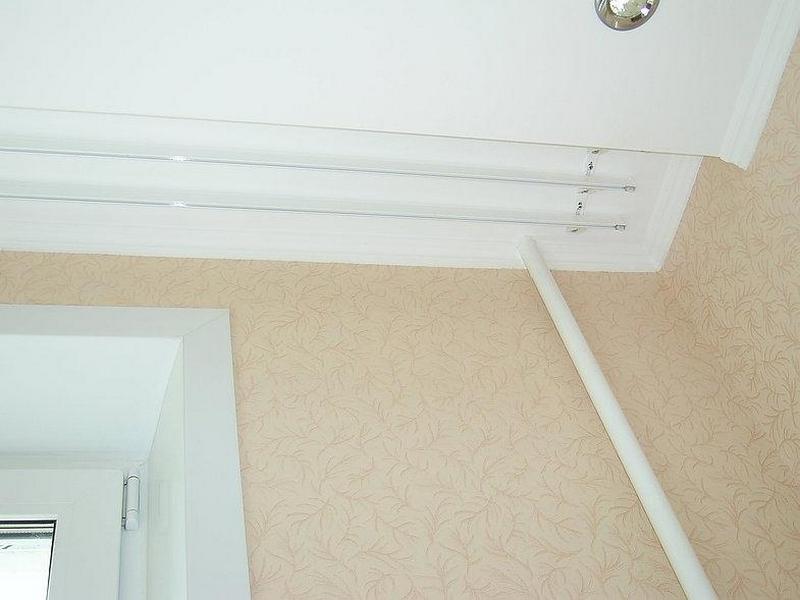 Брус из дерева закрепляется в нескольких сантиметрах от места монтажа карниза, далее подвешивается гардина, на деревянную деталь прибивается багет, на который позднее (после монтажа шторного подвеса) натягивается потолочное полотно. Карниз при этом крепится на сам потолок, выполненный из бетона либо дерева.