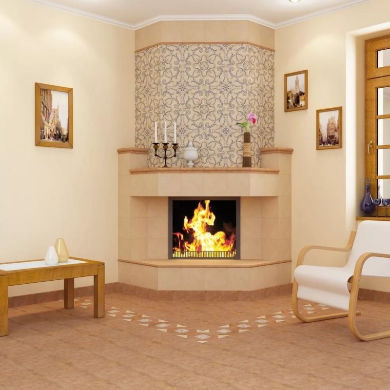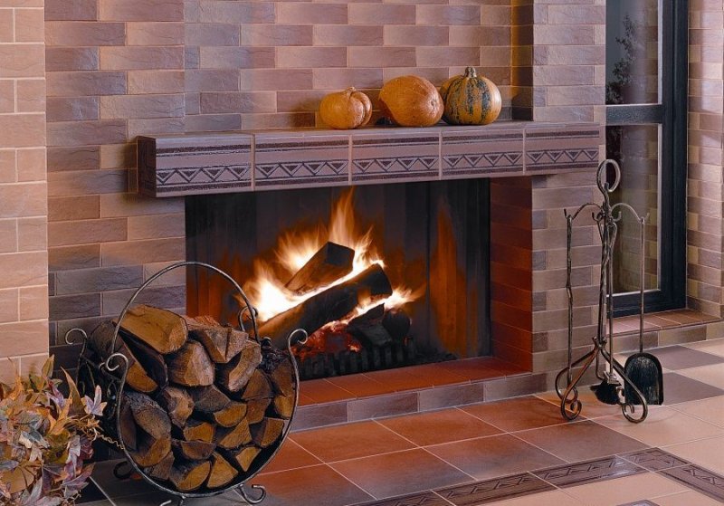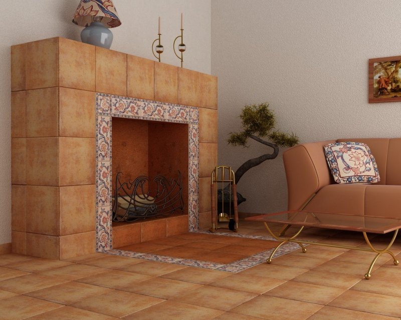 терракота – материал прочный и долговечный, морозостойкий и паронепроницаемый. Плитка не раскалывается при ударах, практически не царапается, подходит для влажных, отапливаемых и неотапливаемых помещений, крепится на любую поверхность. Камин, оформленный терракотовой плиткой, греет дольше других, покрытие хорошо переносит резкие температурные перепады;