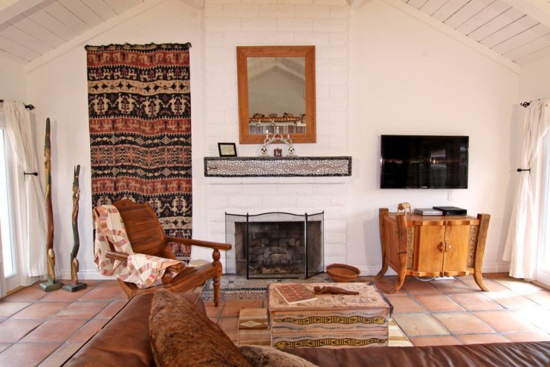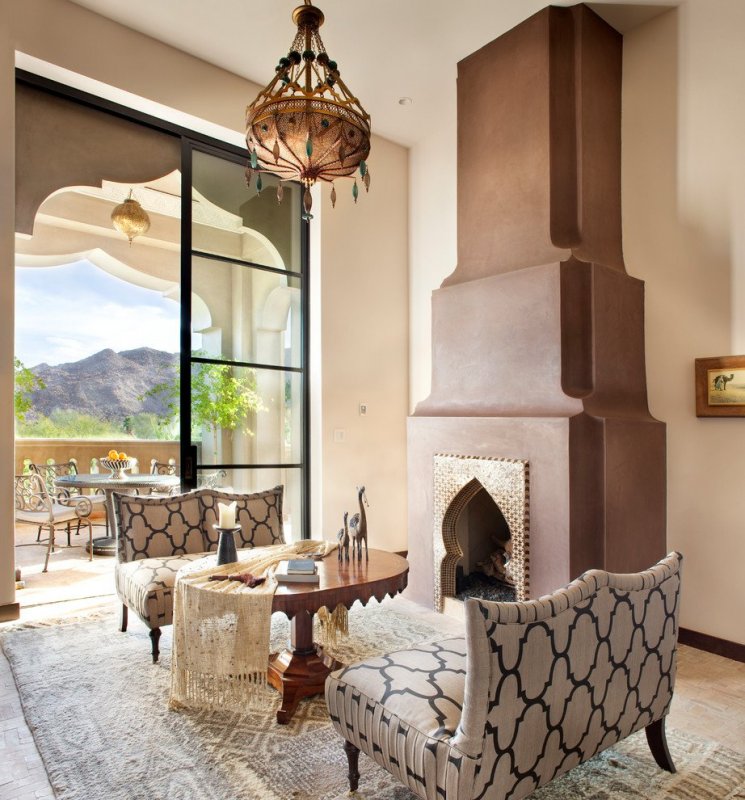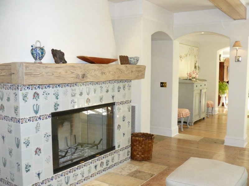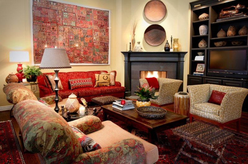 Этнические камины – пестрые восточные и строгие европейские конструкции. Реже это имитация «русской печки», вписанной в соответствующий интерьер. Популярные способы отделки – декоративная штукатурка, побелка мелом, покрытие глиной, смешанной с различными красителями, мозаика из цветной керамической плитки. Узоры здесь полностью отсутствуют, либо являются максимально извилистыми, многоцветными.