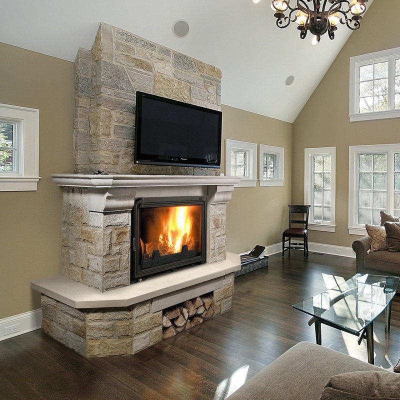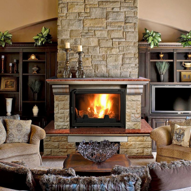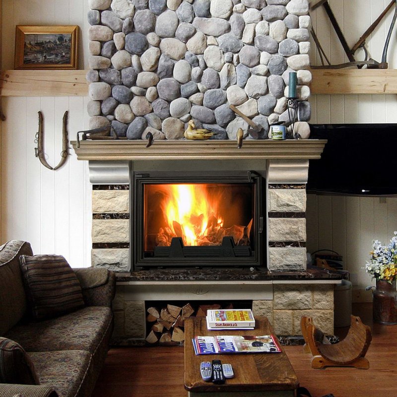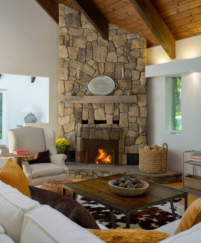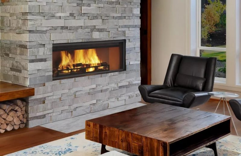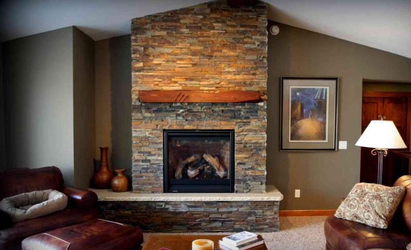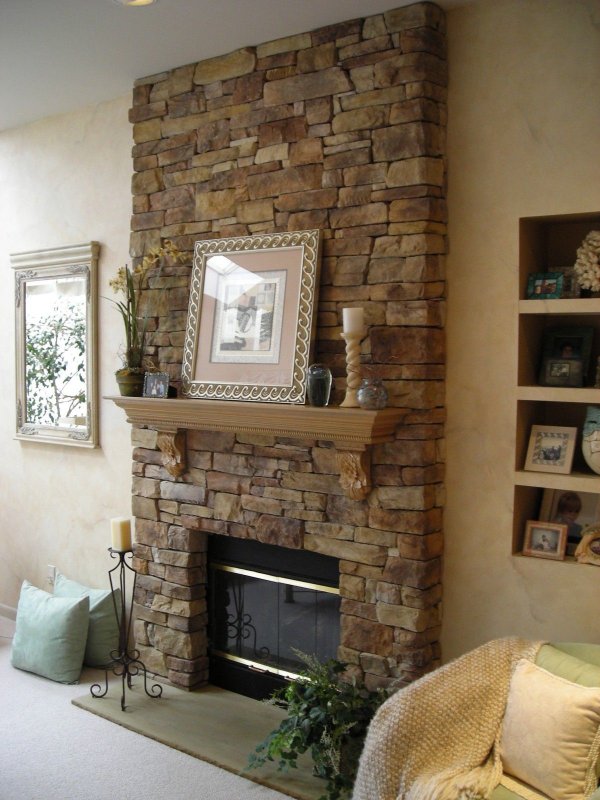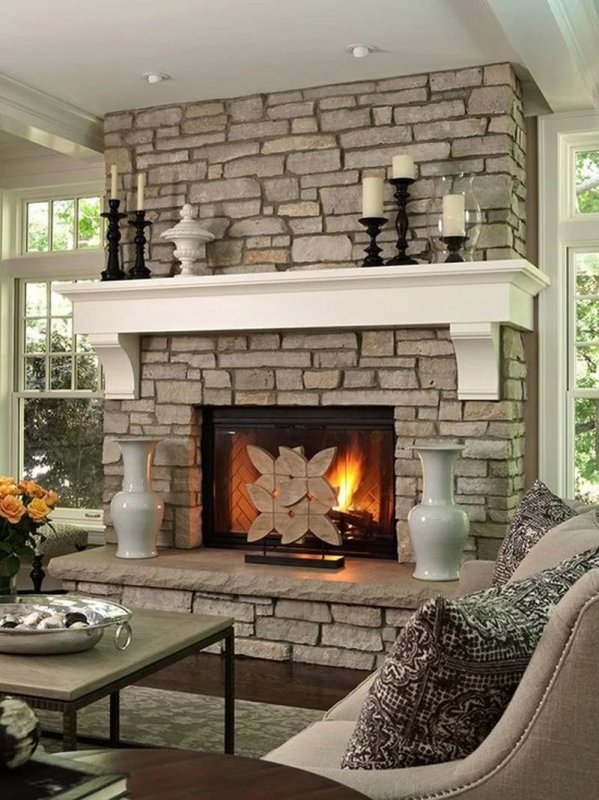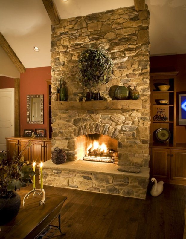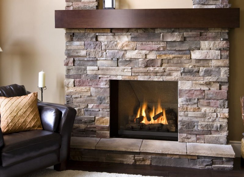 Настоящий природный камень – материал тяжелый, красивый, полностью натуральный. Такая отделка всегда смотрится роскошно, она объемна, достаточно сложна в исполнении, но максимально долговечна – камин прослужит не одному поколению. Устанавливать конструкцию допустимо даже в помещении, которое не отапливается. Камень стоек к истиранию, ударопрочен, а многообразие видов, форм, расцветок позволяет подобрать его под различные интерьерные стили.