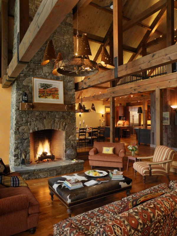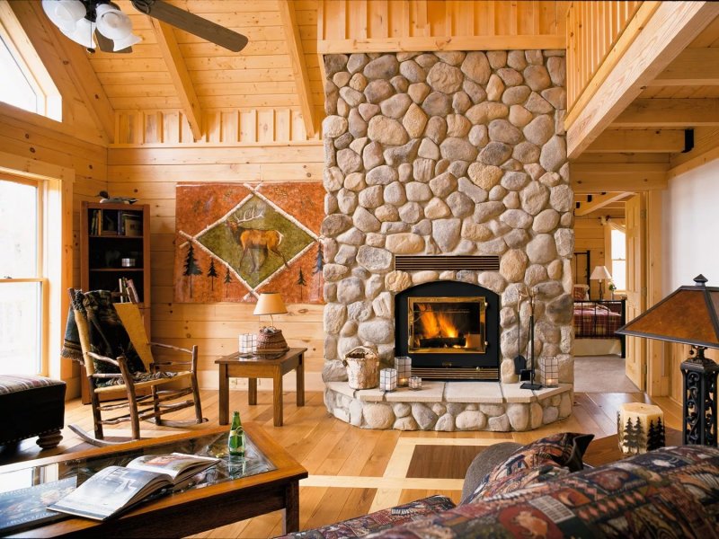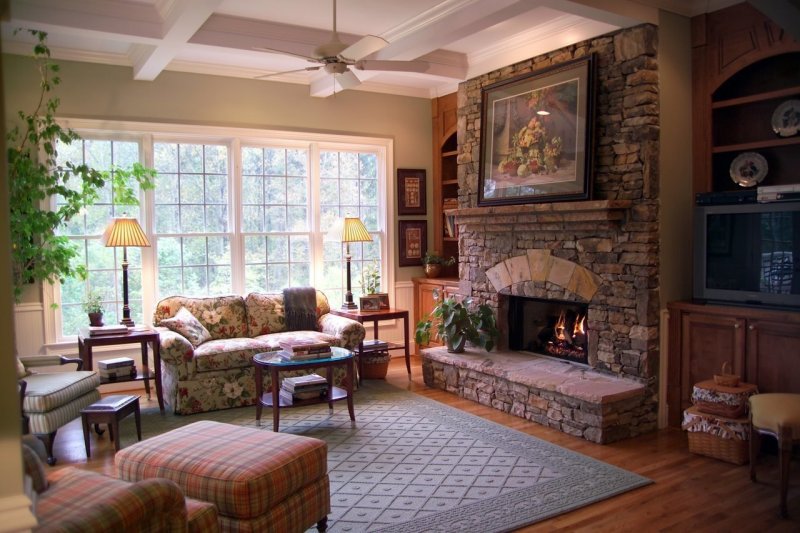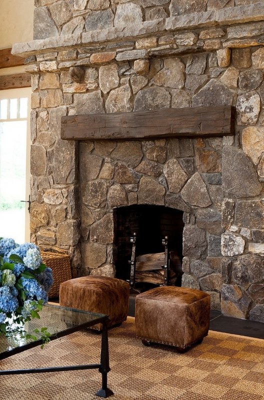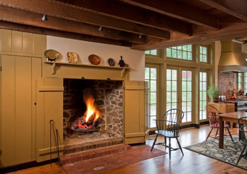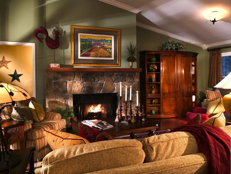 Кантри – стиль, ассоциирующийся с деревенской простотой и уютом, потому камин здесь отделывается «скромно, но со вкусом». Конструкция эта тяжеловата, весьма объемна, потому самостоятельная отделка весьма трудоемка. Сам портал выполняется Д-образным, над топкой располагается толстая балка, чаще всего каменная. Для декора подойдет искусственно состаренный природный камень (ракушечник, песчаник), кладка из кирпича, имитация камня, кирпича.