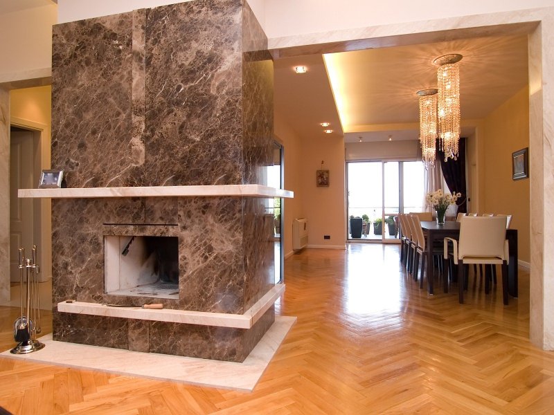 Облицовка настоящим камнем предполагает широкое разнообразие материалов. Для работы подойдут мрамор и травертин, песчаник и гранит, туф и известняк. При выборе подходящего варианта следует помнить, что гладкие материалы в меньшей степени нуждаются в уходе, очистке от загрязнений. Такие камни, как гранит и мрамор, обладают солидным весом, что потребует очень прочного фундамента под камин. Не менее важно, чтобы выбранный декор хорошо вписывался в интерьер.