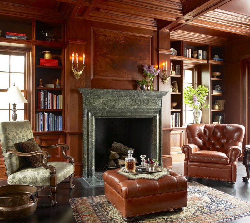 Очаг в английской стилистике делают П-образной формы, оснащая крупной топкой, широкой каминной полкой. Подходящие отделочные материалы – ценные породы древесины (венге, зебрано, мореный дуб, карельская береза и др.) либо их качественная имитация, керамическая плитка, металл (кованые элементы). Большинство линий здесь – ровные, углы – строго прямые, все детали имеют строгую правильную форму.