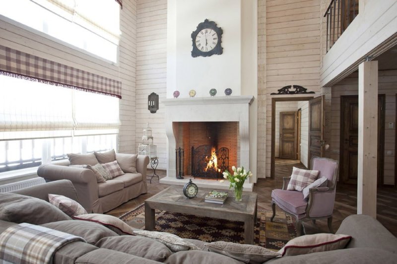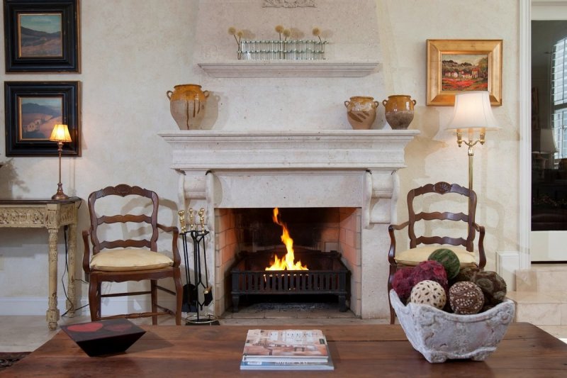Прованс-камин имеет максимально простую форму, но каждая деталь максимально проработана. Цвет конструкции обычно белый, другие подходящие расцветки – пастельные, кремовые, бледно-розовые, голубоватые, нежно-зеленые. В качестве материала подойдет декоративная штукатурка, керамическая плитка с цветочным орнаментом, светлые породы древесины, в том числе окрашенной, искусственно состаренной. Ковка также придется к месту.