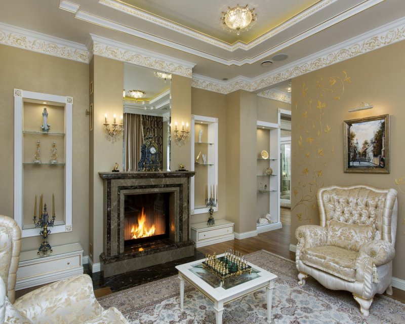 Классика обычно ассоциируется с гармонией, симметрией, правильной геометрией, как самого объекта, так и всей комнаты, где он расположен. Здесь допустимы немногочисленные лепные элементы – молдинги, розетки, полуколонны, пилястры, угловые детали и прочее. Ковка, керамическая плитка, выполненная в светлых тонах с ненавязчивым декором, в том числе имитирующая древесину, также приемлема.