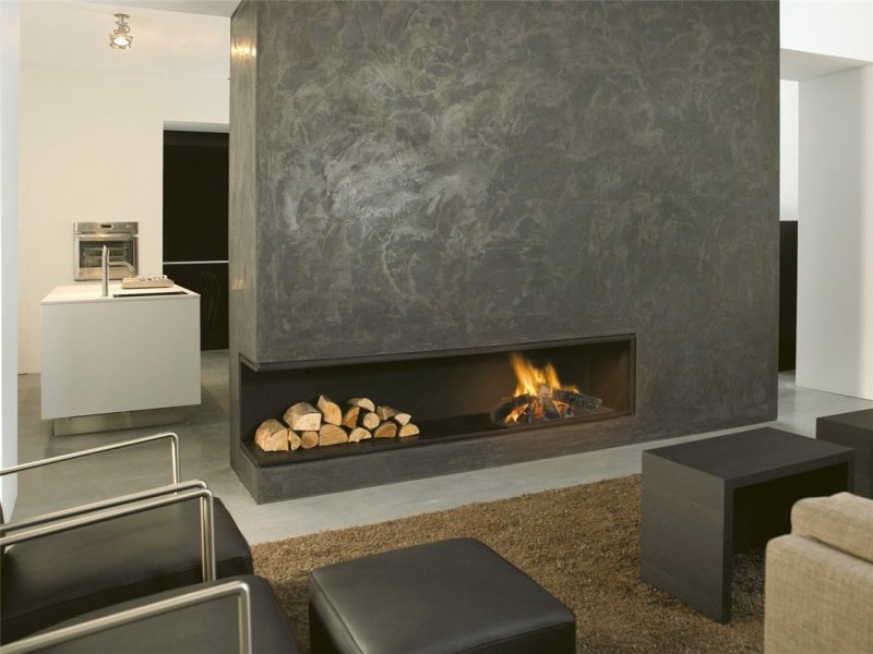 Камин в хай-тек-стилистике обязательно гладкий, блестящий. Редко он расположен у стены – обычно это расположенные в углу, островные, подвесные, вращающиеся конструкции. Основные отделочные материалы – металл, стекло (огнеупорное, прозрачное, узорчатое, частично тонированное и др.).