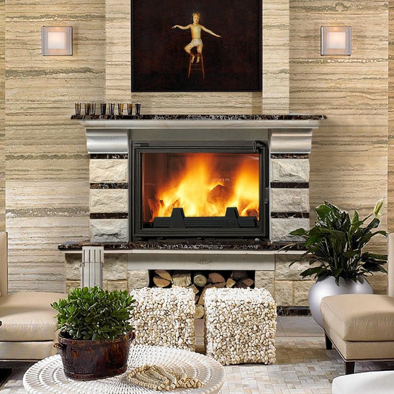 Оформление очага путем обшивания металлическими листами подойдет для многих современных интерьерных стилей. Наиболее популярна отделка из нержавеющей стали, меди и латуни, техника украшения – протяжка, чеканка (в том числе ручная), художественное травление, плазменная резка. Металлы легко сочетать с природным либо искусственным камнем, штукатуркой. Несомненные плюсы такой отделки – сравнительно малый вес деталей, возможность оформить камин практически в любом интерьерном стиле (ретро, классика, хай-тек и др.), не перестраивая его полностью. Отдельно стоящее сооружение, полностью выполненное из металла, легко подключить, разместить в любой точке пространства. Главные минусы – вероятность получить серьезные ожоги при касании металлической поверхности, неравномерность нагревания помещения, быстрое остывание.