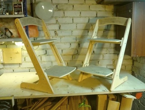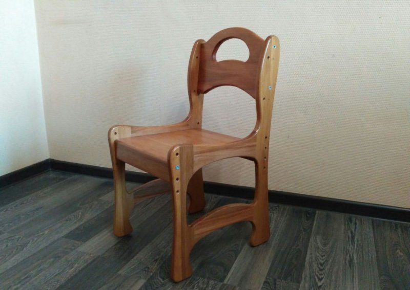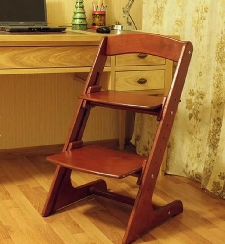 Конструкция, высота которой меняется в широких пределах, может использоваться ребенком несколько лет, потому должна делаться максимально прочной. «Растущий» стульчик выполняется из двух наклонных L-образных боковин с перфорацией, трех соединительных царг, узкого сидения, ступеньки для ног. Стойки делаются из металла либо древесины, сидушка и упор под ноги – из дерева либо ДСП. Каркас ни в коем случае не должен гнуться. Сидение здесь легко переставляется выше-ниже, рекомендуемый «шаг» — 10-15 см.