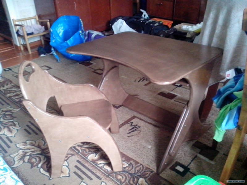 Все части вымеряются, нарезаются, шлифуются, сидение крепится на высоте 15-25 см от уровня пола. Чтобы не было острых краев, их обрабатывают шлифмашинкой либо простой наждачной бумагой. Конструкция собирается с помощью клея, чтобы соединение было прочным, до надежного схватывания стул и стол помещают в струбцины. Места соединений еще раз шлифуются, изделие раскрашивается вручную либо оставляется в первозданном виде. Важно, чтобы стульчик свободно помещался под столиком.