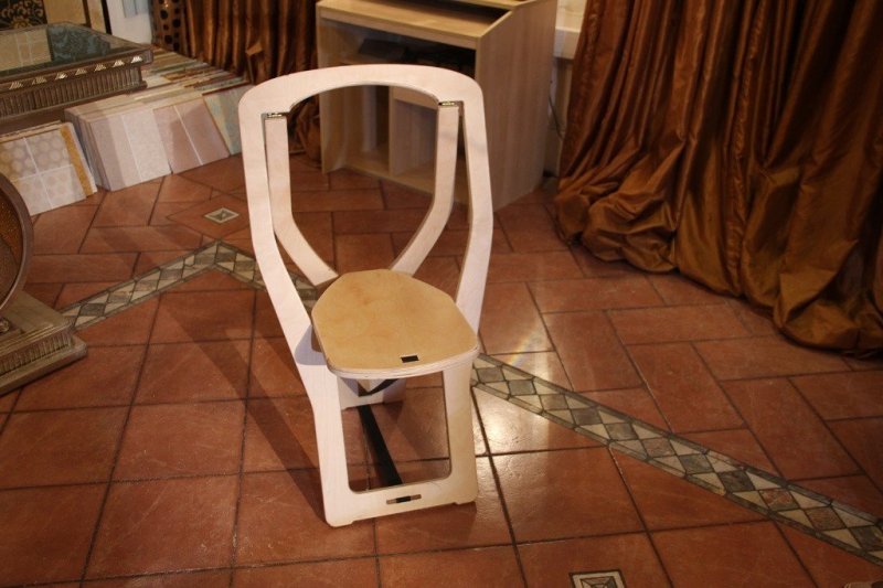 Для изготовления раскладного стульчика понадобится фанера, толщиной не менее 10 мм, электролобзик. На бумаге следует набросать общий вид изделия, потом отдельные его части – две боковины, сидение, спинку, поперечные планки. Все детали делаются с пазами, плоскими шипами – конструкция собирается без использования клея, металлического крепежа. Далее детали переносятся непосредственно на фанеру, выпиливаются. Боковины после вырезания накладываются друг на друга, для сравнения – если они не идентичны, производится корректировка. Все детали тщательно шлифуются по краям – острые углы, кромки в детской мебели недопустимы. Предмет собирается, для проверки «работоспособности», разбирается опять. Детали окрашиваются либо лакируются в один-два слоя, высушиваются, после чего изделие собирают, используют по назначению.