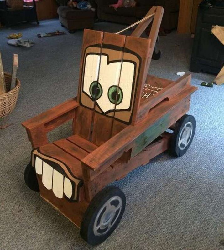 Стульчик-машинка порадует как годовалого, так и четырехлетнего ребенка. Для работы понадобятся доски либо фанера, электролобзик, клей, яркие краски. Для начала на бумаге рисуют эскиз понравившейся машинки, продумывают ее силуэт, применимый для стула, переносят на листы фанеры.