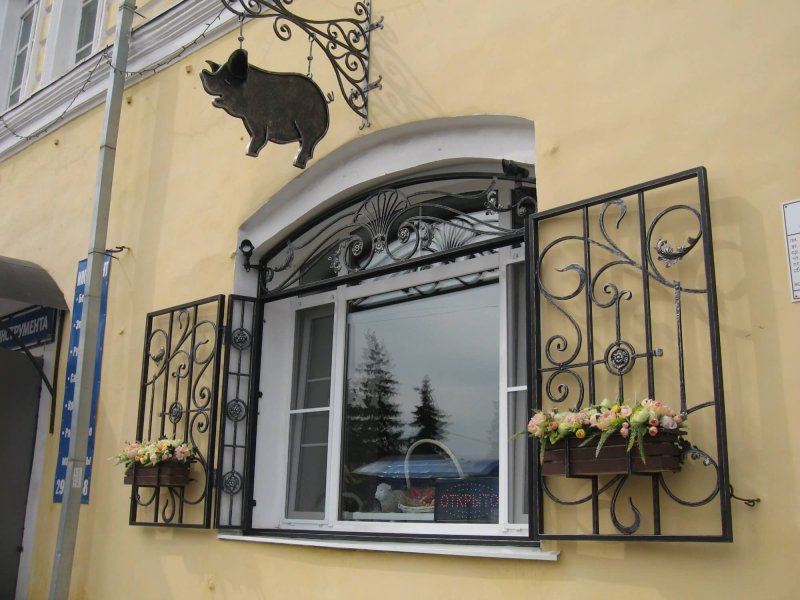 Кованые варианты изготавливают в виде щитов или решеток. Декоративную функцию могут выполнять и те и другие, хотя главная в любом случае защитная. Щиты актуальны для пустующих зданий, решетки же позволят сохранить естественное освещение на должном уровне. Несмотря на то, что глухие створки лучше защищают от вандалов, решетки эффективнее против взломов, ведь металлический каркас более устойчивый. Кованые ставни подходят не для всех фасадов, однако в некоторых случаях становятся их главными декоративными деталями. В качестве примера можно привести здания в стиле модерн и ар-нуво. Решетчатые ставни оформляют в виде закругленных узоров, иногда с подставками под вазоны. Владелец жилья сможет составить красивую композицию с живыми цветами. Украшенное подобным образом окно органично «вольется» в фасад с настенными вьющимися растениями.