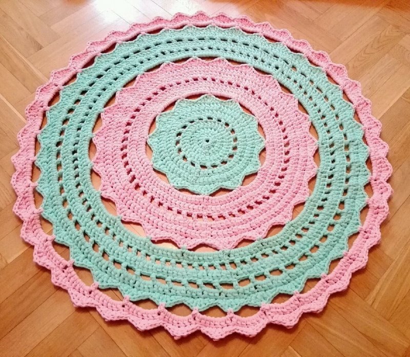 крючком круглый половик вяжется от центра столбиками с накидом или без. Прибавки производятся в каждом ряду, по 6-8 петель. Высота одного ряда – до двух см, каждый из них можно выполнить в разном цвете;