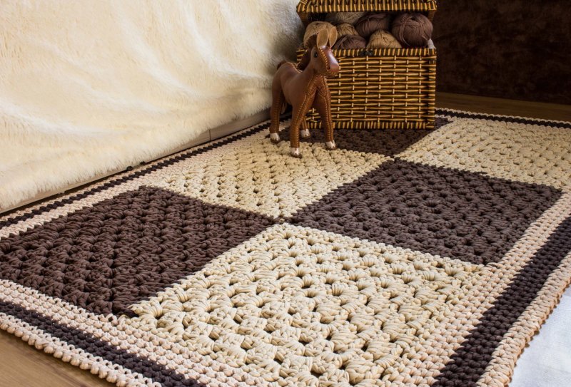 Вязаные ковры – наиболее популярный вариант исполнения. Для вязания из трикотажного материала потребуется крючок или спицы, толщиной 9-15 мм. Работу обычно делают по определенной схеме. Вот несколько простых вариантов: