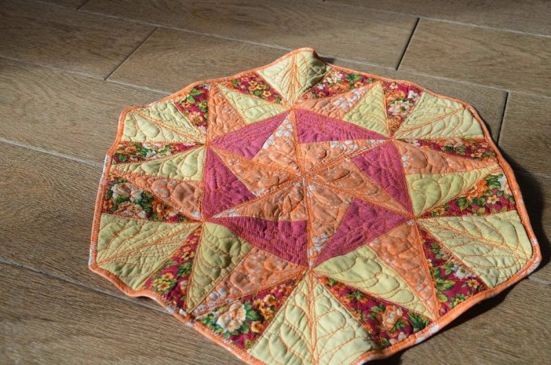 Техника пэчворк – это лоскутное шитье. Для самостоятельного выполнения понадобится ткань разных цветов – как минимум двух-четырех, но чем больше, тем интереснее выйдет предмет. Текстиль нарезается на квадраты, реже – на треугольники, многоугольники одинакового размера, которые сшиваются друг с другом с изнаночной стороны на швейной машинке. Полученное полотно нашивают на плотную текстильную основу, края оформляют косой бейкой.