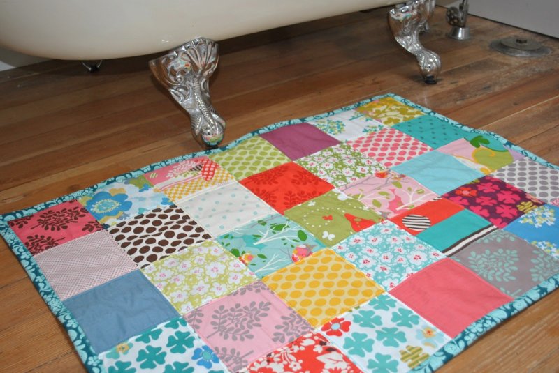 Сшивание мягкого половика производится из множества крошечных подушечек, выполненных из кусочков трикотажа с любой набивкой. Размеры деталей – от трех-четырех см, форма – любая. Изделие иногда выполняется из асимметричных фрагментов, но чаще – из круглых. Подушечки крепятся друг к другу нитками, подобранными в тон, нашиваются на кусок плотной ткани подходящей формы. Не обязательно делать предмет однотонным – варианты с узорами, цветами, в виде животных и птиц смотрятся наиболее интересно.