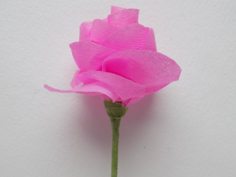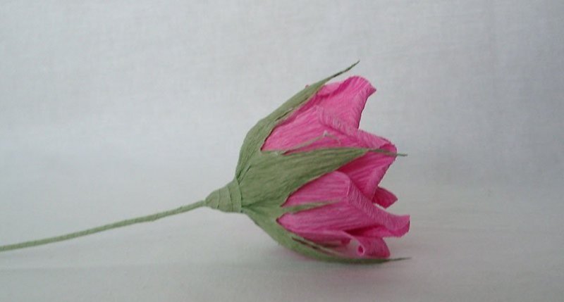 Цветок состоит из стебелька, нескольких лепестков, чашелистиков. Чтобы сделать самую простенькую розочку, понадобится зеленая и розовая гофрированная бумага, зеленый скотч, палочка для стебелька, ножницы.