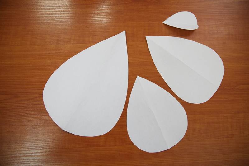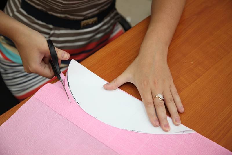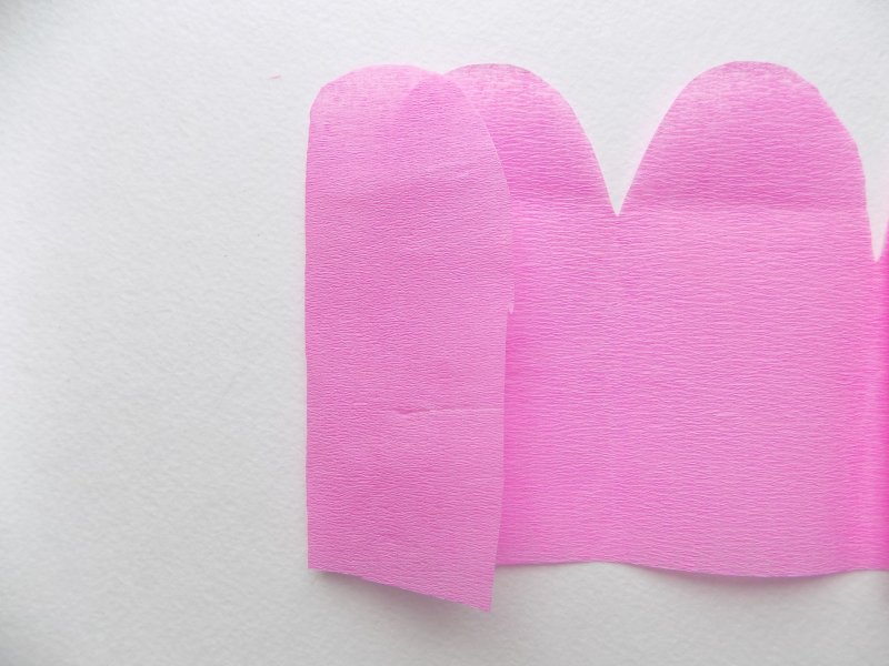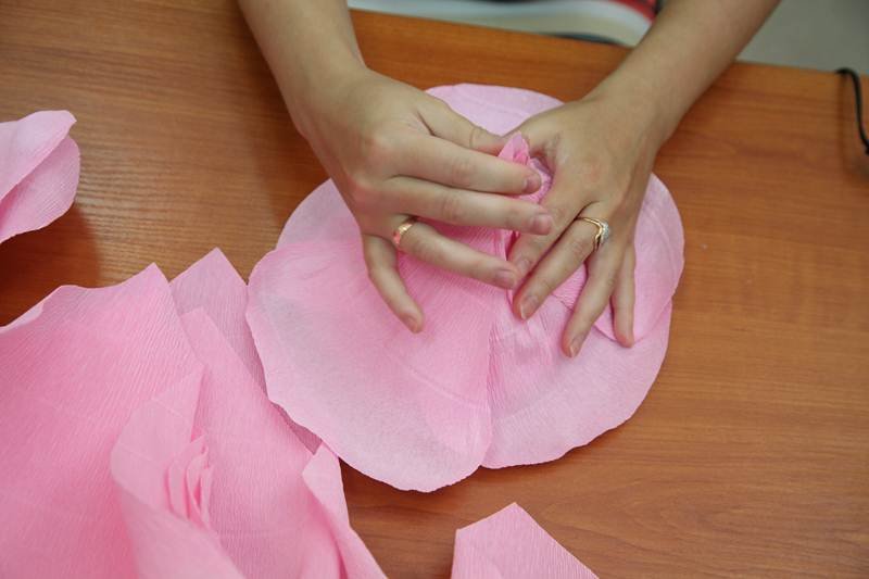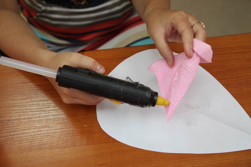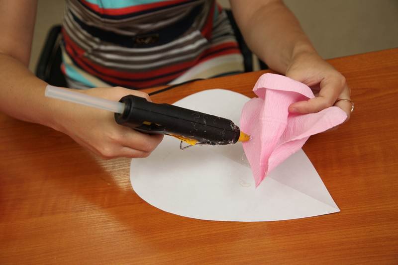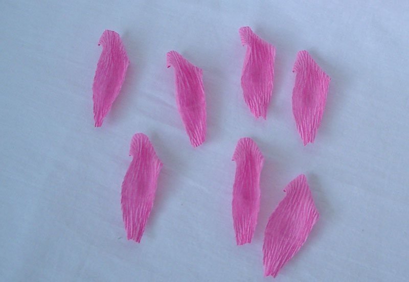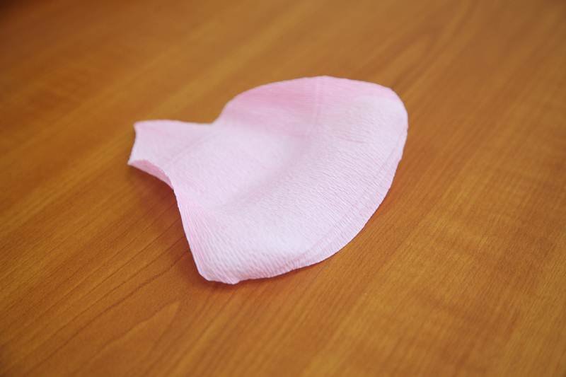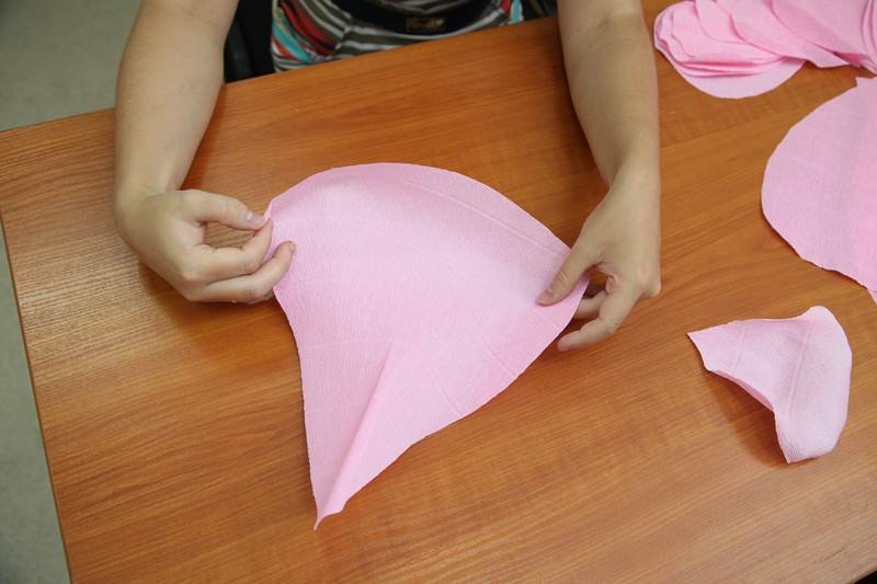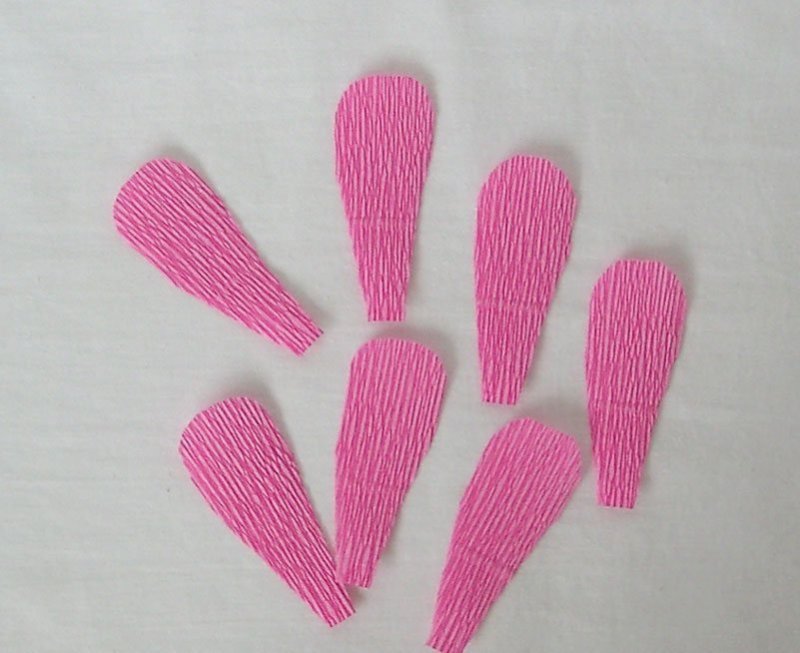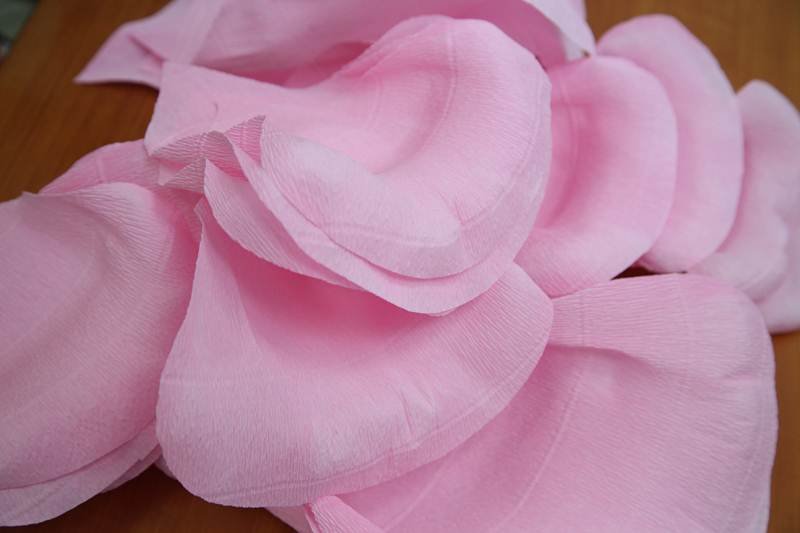 из розовой гофробумаги вырезают пять каплевидных лепесточков, плюс 15 – в форме сердечек;