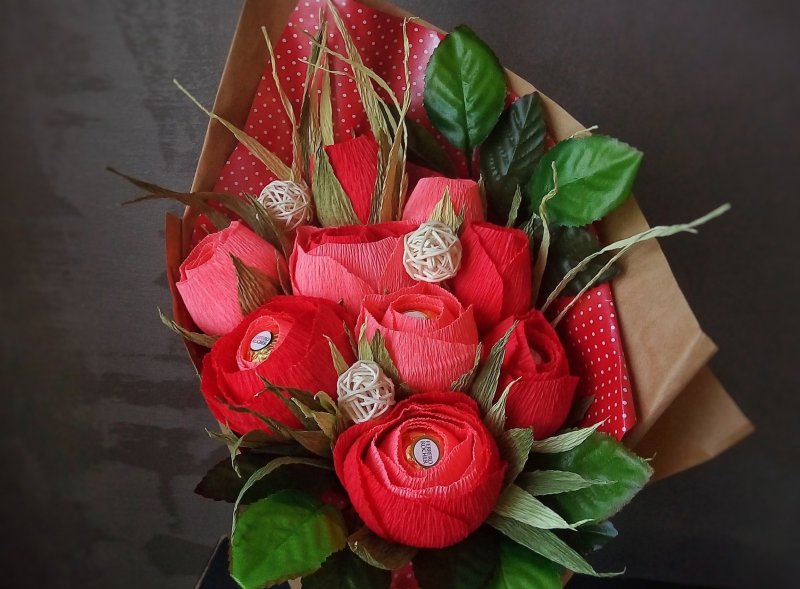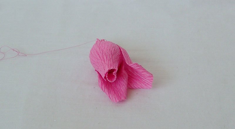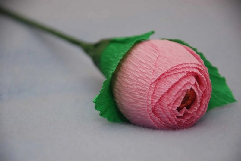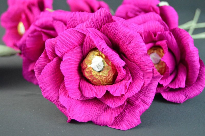 Размеры лепестков здесь – 8 на 9 см, чем большее количество деталей выполнено, тем пышнее, роскошнее выйдет цветок. Первым лепесточком плотно обкручивают конфетку, снизу фиксируют ниточкой, чтобы она не выпала. Следующую деталь слегка растягивают, накручивают сверху, но со смещением в сторону, после добавляют еще 9-13 лепесточков. Чашелистик клеят в самом конце – перед этим бумагой обматывают стебелек.