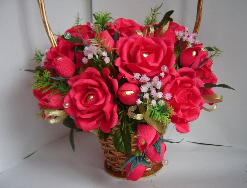 Розы в шляпной коробке, корзине, литровом ведерке из-под мороженого смотрятся солиднее, особенно, если внутри каждой розочки – вкусный сюрприз. Сама коробочка оклеивается тканью, креповой бумагой, обоями, опоясывается лентой, декорируется бисером и блестками. Желательно использовать цветы разного колера – светлые по краю, более темные – в центре. На дно наклеивается кусок толстого пенопласта, в который втыкаются серединные розы на тонких проволочках, крайние же обычно приклеивают на бортики изнутри. Между самими бутонами равномерно вставляют бумажные, другие искусственные листья.