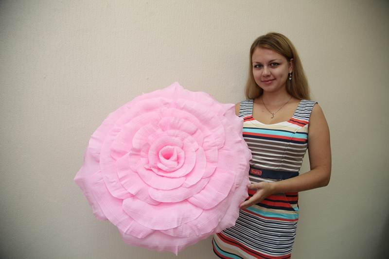 Украшенное даже несколькими огромными розами помещение сразу обретает праздничный вид. Ростовые цветы – идеальный фон для праздничных фотосессий, детских праздников, создания романтических интерьеров и др. Материала для них потребуется много – как минимум два-три рулона, но результат превзойдет все ожидания. Также необходимо изготовить жесткое основание из гофрокартона, нарезаемого ножницами по определенной схеме. Еще потребуется «горячий клей», гнущаяся металлопластиковая трубка, гибкая проволока для листьев, большой шарик из пенопласта, нитки, синтепон, фоамиран, красивая ткань и др.