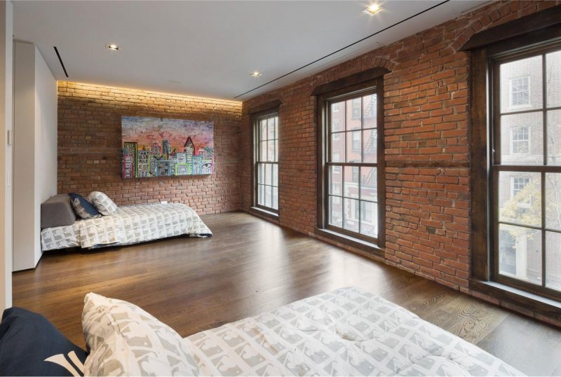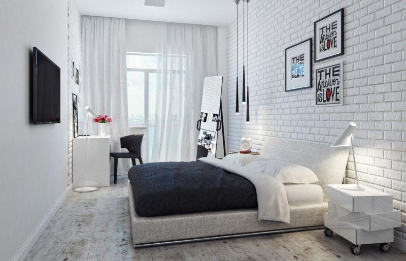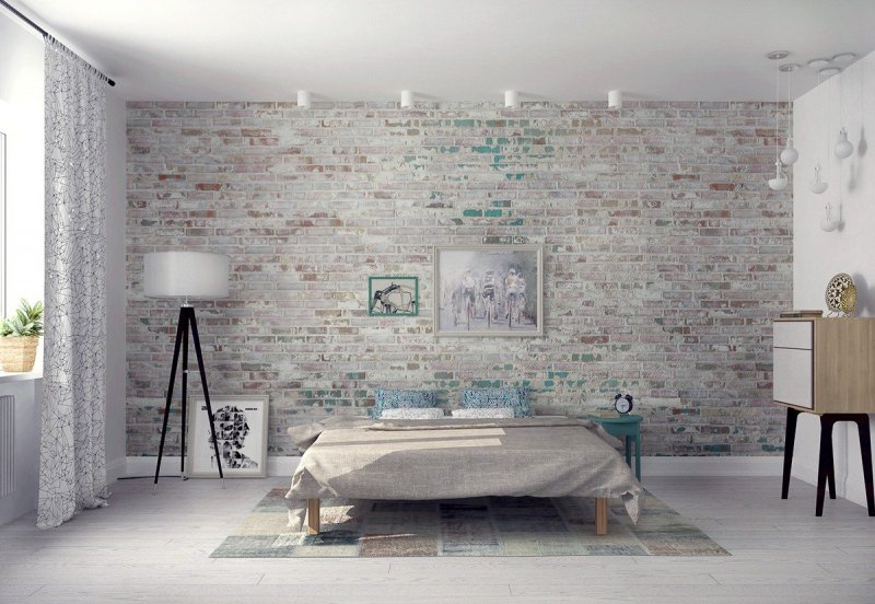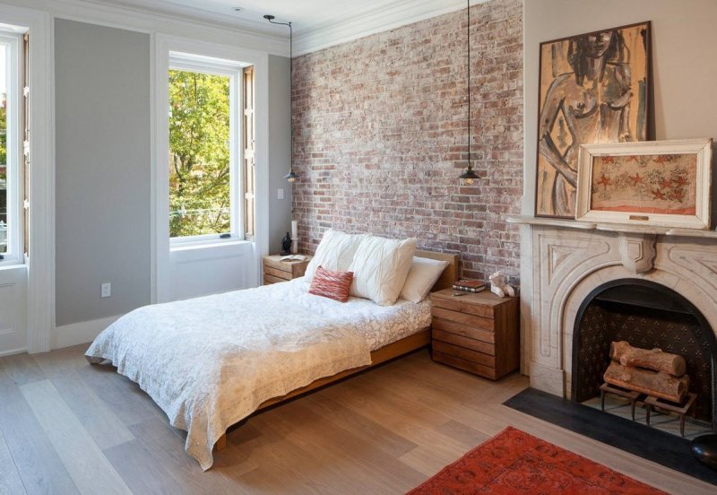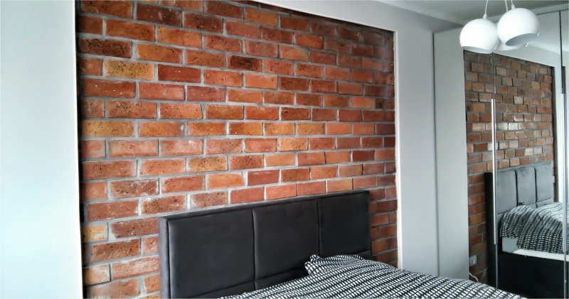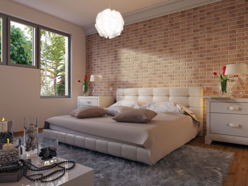 Спальня. Чаще материалами с имитацией кирпичной кладки отделывают участки поверхности за изголовьем кровати. Можно использовать одно стилевое направление или сразу несколько.