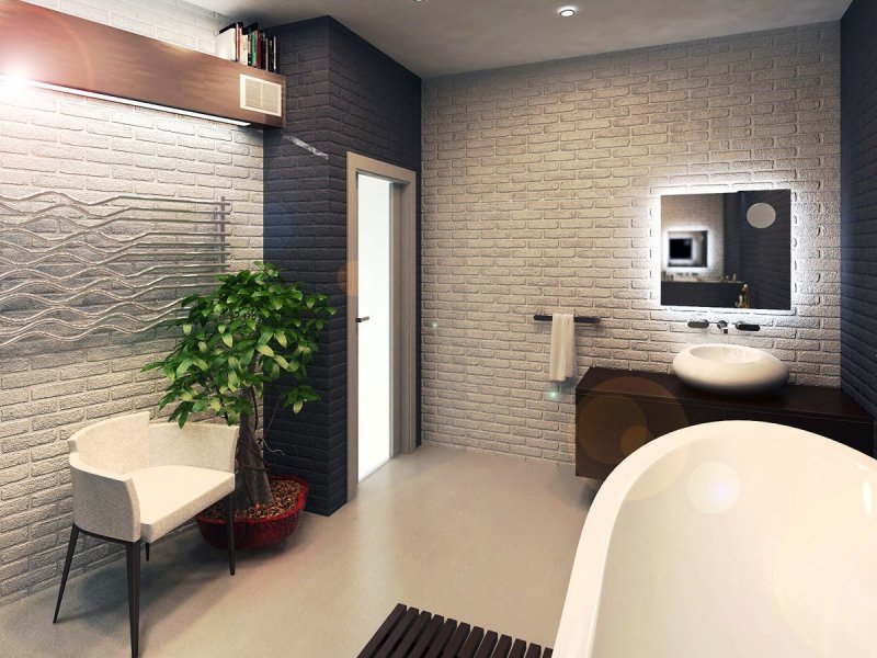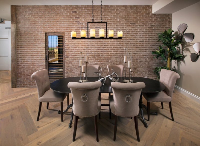 Комбинировать с кирпичными обоями можно обычные бумажные полотна подходящих оттенков или другие отделочные материалы. Хорошо с имитацией кладки будет смотреться натуральный, искусственный камень, стекло, дерево, хромированные элементы.