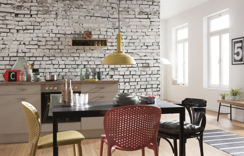 Благодаря широкой цветовой гамме полотен под кирпич, можно выделить одну акцентную стену более темными обоями с плавным переходом к бежевому или насыщенно-красному. Однотипная отделка всех стен – отличный фон для интерьерных инсталляций. Белые, серые полотна с кирпичным рисунком будут уместны в аскетичных интерьерах. Разным может быть не только цвет, но и рисунок. Популярные варианты – ровная кирпичная кладка, «елочка», с остатками штукатурки.