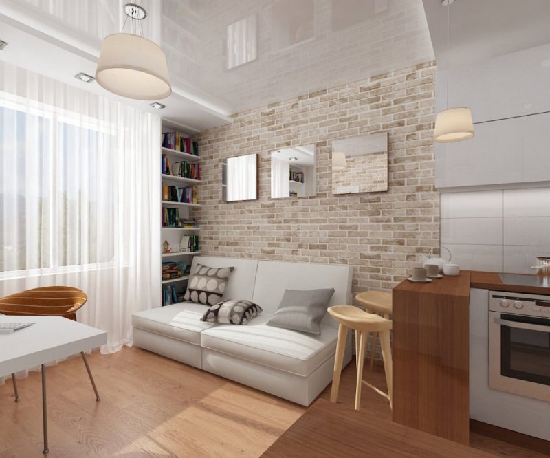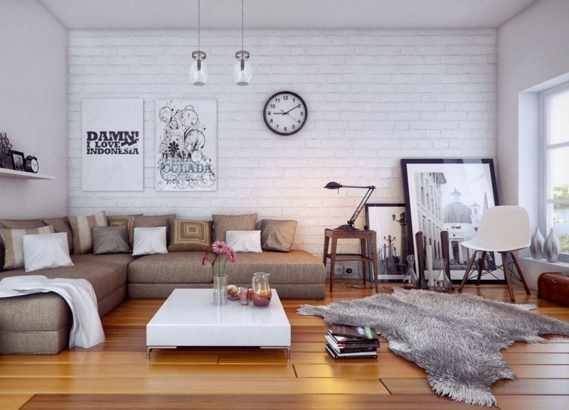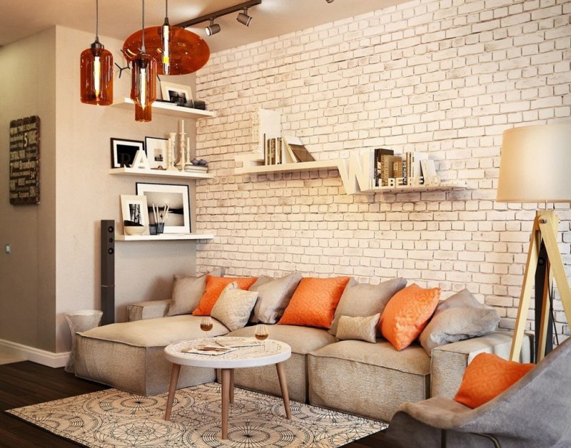 В светлых интерьерах обои под кирпич встречаются довольно часто. С помощью белой кладки разбавляют однотипность отделки помещения. Основная цветовая гамма остается неизменной. Можно оставить одну акцентную стену бежевой или рыжей. Это сделает интерьер оригинальным и уютным.