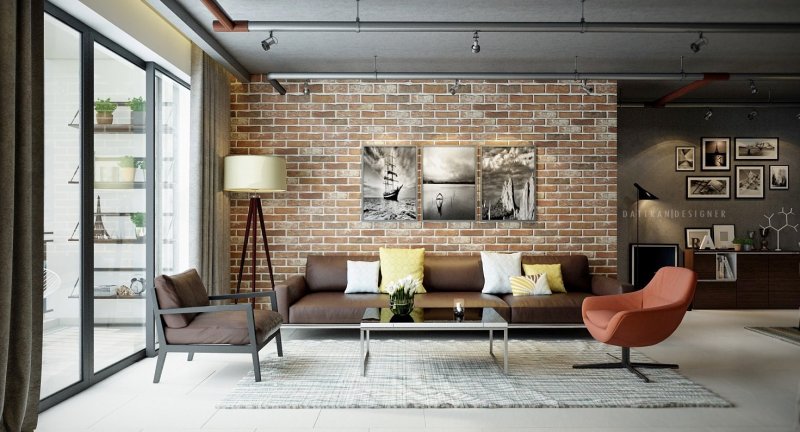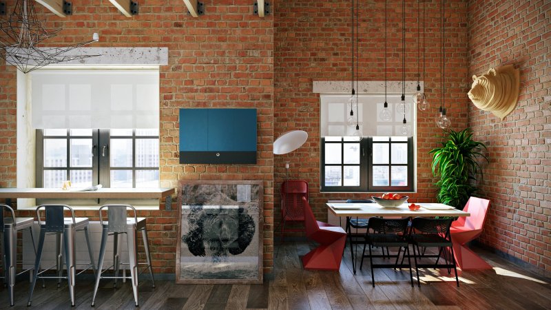 Нестандартное сочетание уличного стиля с другими направлениями позволяет создать одновременно роскошный и невычурный интерьер. Главный признак индустриальной комнаты – обсыпающиеся бетонные стены, кирпичная кладка. Но совсем не обязательно превращать комнату в запыленное помещение. Современные производители стройматериалов предлагают большой ассортимент обоев с имитацией оформления под кирпич.