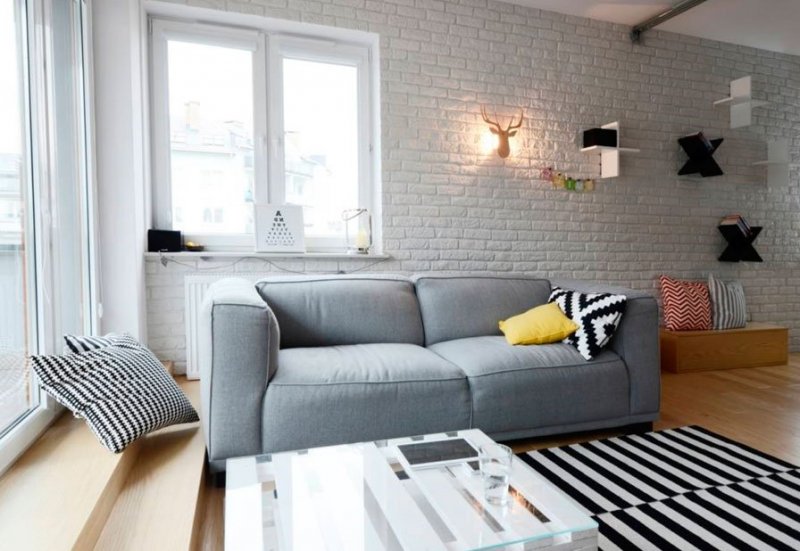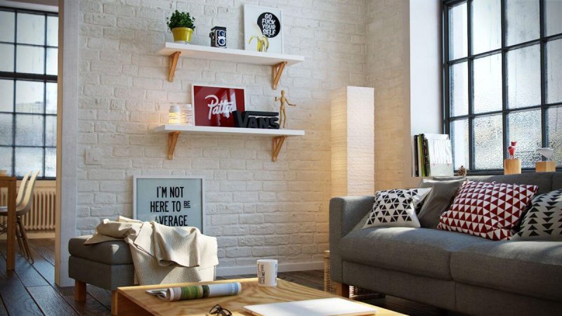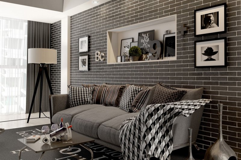 Обои под кирпич светлых тонов – подходящий фон для фотографий и картин. Серая кирпичная стена подойдет для размещения яркого декора на белоснежных полках. Темные участки обоев с тиснением будут отличным фоном для аудиотехники, домашнего кинотеатра. Разбавят монохромность интерьера отдельные участки полотен с чередующимися белыми, черными, серыми кирпичиками.