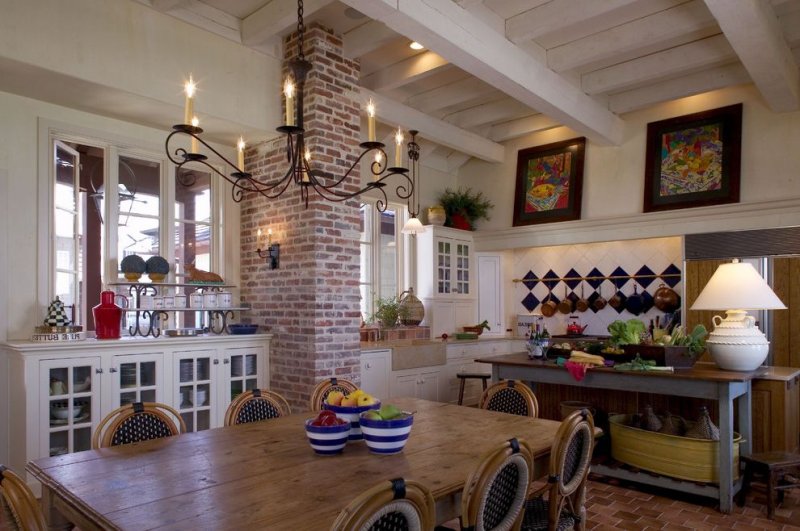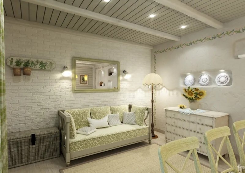 Красиво будут смотреться обои прованс под кирпич с узором и орнаментом. Они заиграют новыми красками под разным типом освещения. Без материалов-компаньонов тут не обойтись. Оставшиеся стены оформляют простыми однотонными обоями, с цветочным рисунком, в клетку или полоску.