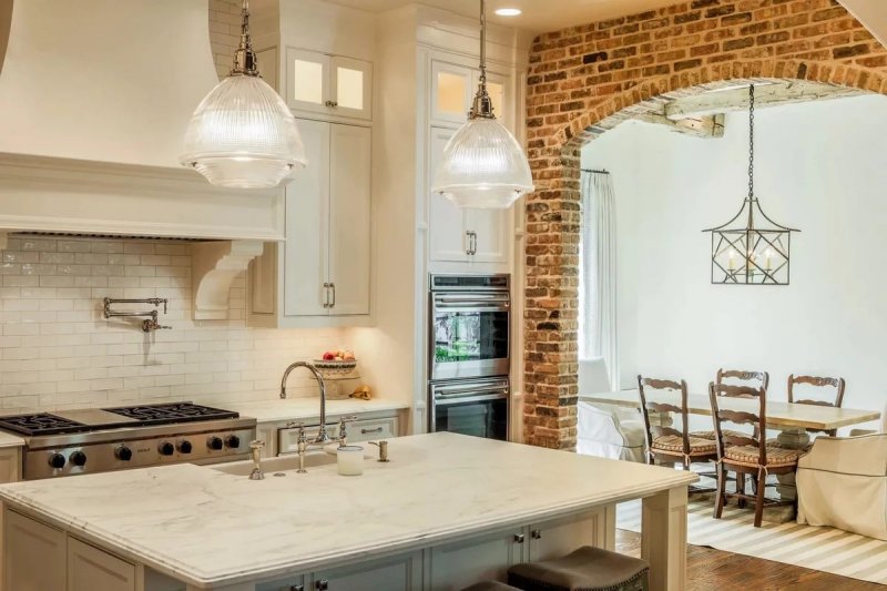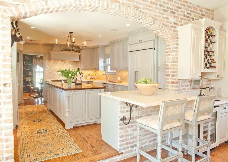 Для теплого спокойного прованса подойдут обои под кирпич бежевых, песочных оттенков с имитацией выбеленной кладки. В зависимости от назначения комнаты используют ровные полотна, фотообои или материалы для отделки с явно выраженным рельефом. Трещинки, потертости, неровности добавят реалистичности, отлично сымитируют грубую кирпичную стену в деревенском стиле.
