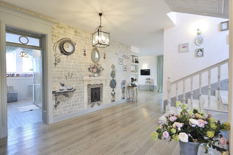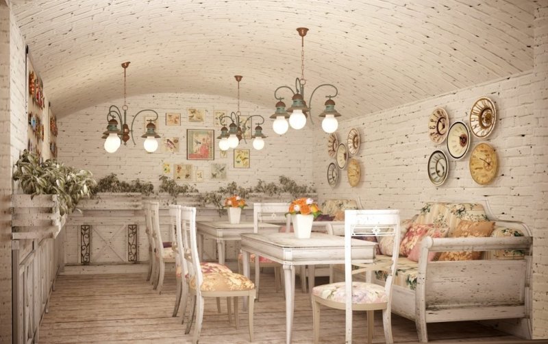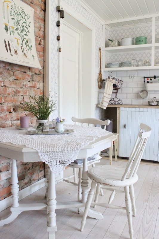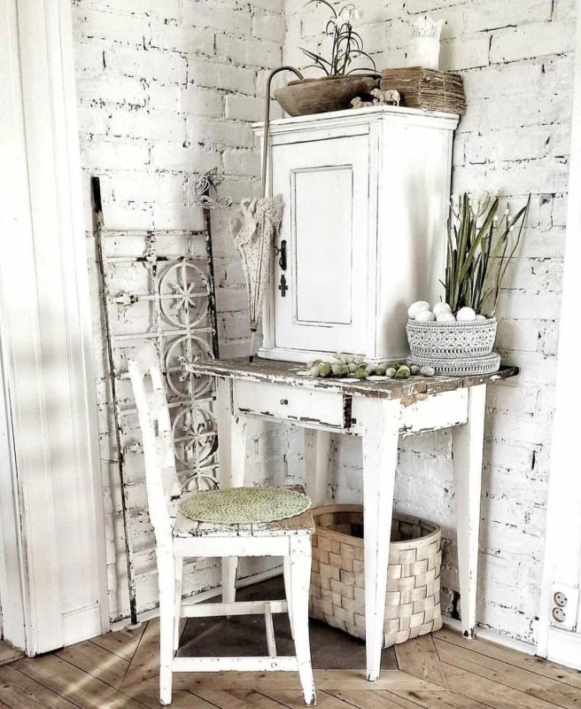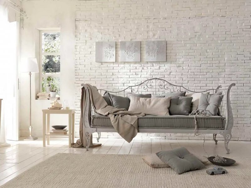 Стилеобразующие предметы интерьера – старые и давно забытые дизайнерами вещи или искусственно состаренные. Обои под кирпич в таких комнатах очень частое явление. Отделку с имитацией кладки делают белой, и чаще оформляют таким образом только одну акцентную стену. Хорошо смотрится в стиле шебби-шик оформление функциональной зоны. В просторных комнатах, квартирах студиях таким способом выполняют зонирование.