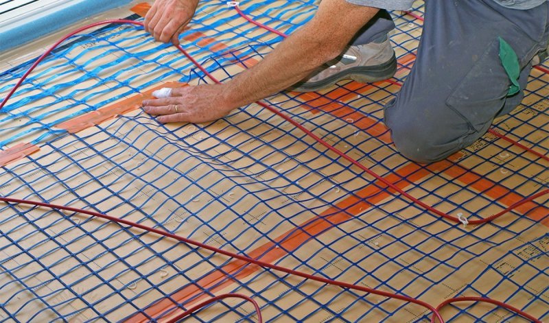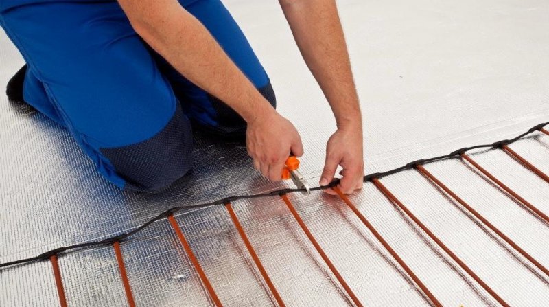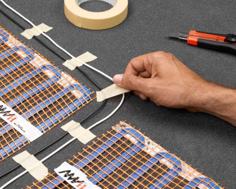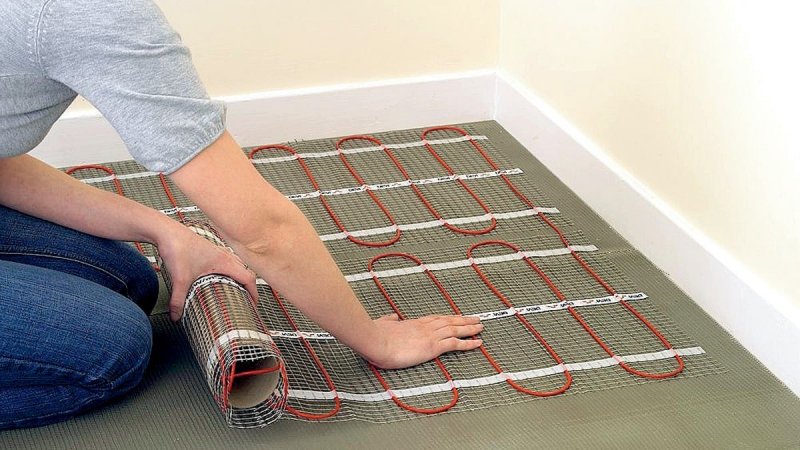 Установку производят путем поочередной укладки отдельных матов. Сначала не помешает составить небольшой план. Далее начинаем установку: монтируем распределительные коробы и трубки для терморегулятора. Для формирования стяжки используем что-то на выбор: жесткую плиту толщиной 2—3 см, пенополистирол, жесткие пробки, пенопласт. После этого проверяем сопротивление мата и раскрой. Под параметры планировки режем стекловолокнистую сетку. Делаем манипуляцию аккуратно, внимательно контролируя местоположение кабеля. Процесс облегчит тот факт, что у сетки нет лицевой и тыльной стороны. Мат укладывают на подготовленную стяжку. Сетку с тонкокабельной системой размещаем так, чтобы до стен осталось хотя бы 10, а в идеале — 15 см. Отступ от батарей нужен на уровне 20 см. Далее размещаем термомат — холодными концами в сторону блока питания.