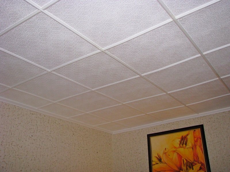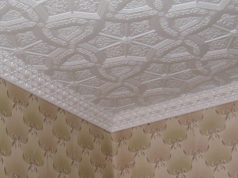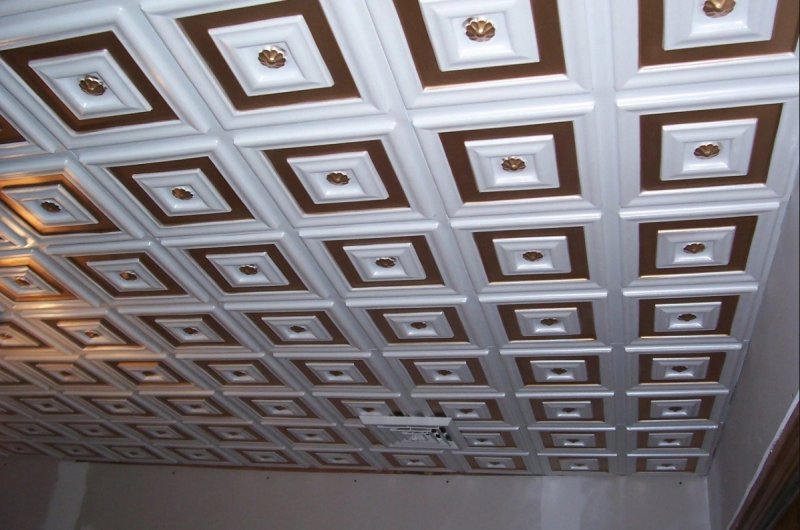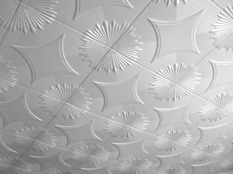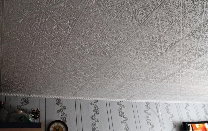 Ее получают методом штамповки (прессования), отчего она и получила название. Прессованную плитку производят из основы в виде пенополистирольных блоков. Пресс сжимает сырье до толщины в 6—8 мм. Качество изделий получается не самым высоким, однако производители компенсируют это невысокой ценой. Это самый доступный вариант среди основных предлагаемых рынком. Поверхность имеет пористую рыхлую текстуру, что плохо влияет на эксплуатационные качества. Загрязнение нужно оттирать сразу, а мыть вообще не рекомендуют. При этом не помешает окрашивание водоэмульсионными растворами. При выборе обязательно руководствуются запасом прочности, потому что плиты — относительно хрупкие и часто ломаются. Неприятная особенность есть и в строении краев: при резке они иногда крошатся. Перед облицовкой потолка плиты 3 дня содержат в сухом помещении — во избежание усадки и появления щелей на отделочном слое.
