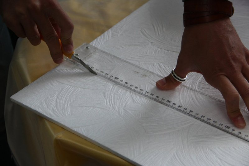 Понадобятся линейка и карандаш: для разметки рядов плитки, обозначения места под фриз и линий для обрезки пенополистирола. Лишние фрагменты устраняют с помощью малярного ножа. Перед обработкой потолка также готовят емкость для смешивания. Если материалом выступает экструдированный пенопласт, то на поверхности обязательно обустраивают слой штукатурки или шпаклевки. Понадобятся сами материалы и шпатель — для перемешивания растворов и удобного нанесения. Шпаклевкой в дальнейшем обрабатывают швы готового покрытия. Пенополистирольный потолок собирают только после грунтования. Поэтому дополнительно готовят подходящую по размеру кисточку. После монтажа плитки обычно устанавливают фризы. В этом смысле не помешают также уголки для пенопластовых вариантов. Ну а главным связующим звеном в красивой потолочной композиции является клей. Подойдут смеси под пенопласт и клей-пена.