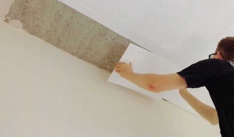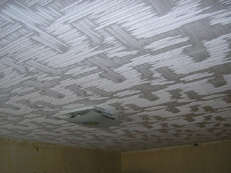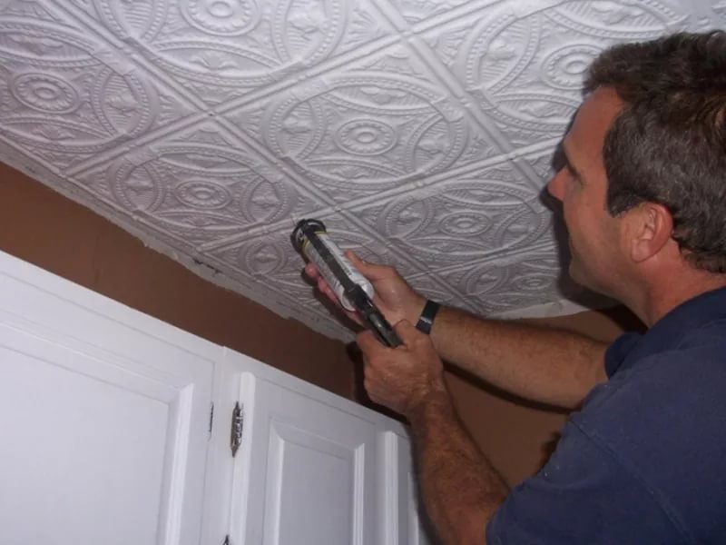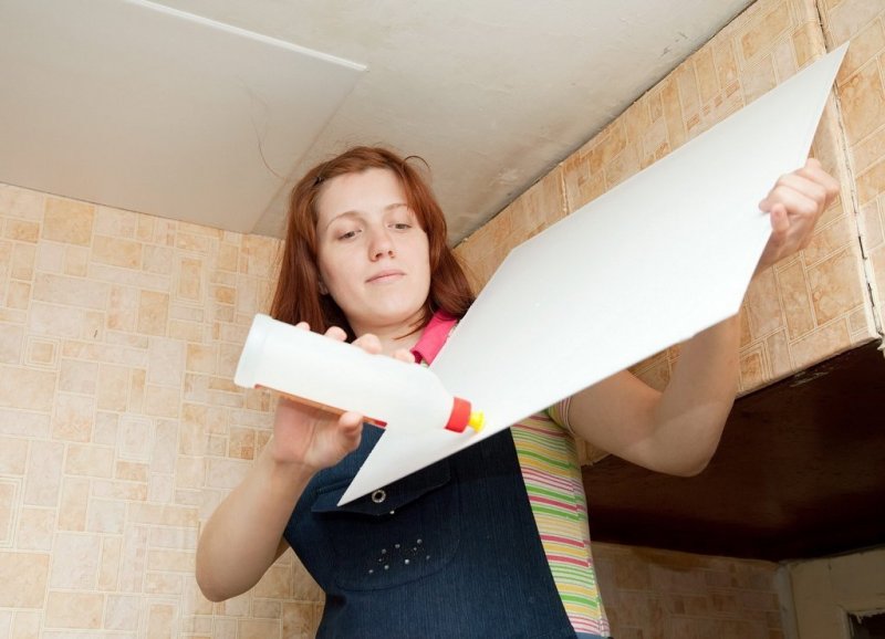 Первым делом устраняют старую отделку. В процессе используют шпатель для снятия материала и воду, чтобы размочить его. Красящие вещества придется устранять растворителем или же предварительно прогревать феном. Штукатурку при этом оставляют, но только если на ней не было выявлено слабых мест. Проверку выполняют легкими ударами молотка. В случае чего слабые места просто заделывают. Затем потолок полностью очищают от грязи и пыли. Следом за этим устраняют трещины, углубления и прочие дефекты — так поверхность готовят к грунтованию. После нанесения раствора потолок можно укрыть еще и шпаклевкой. Ее зашкуривают наждачкой после высыхания. Внешний вид потолка на 50 % будет зависеть от гладкости поверхности под плиткой. К поклейке плит приступают, когда все подсохнет, но перед этим этапом следует еще раз все проверить: небольшие недостатки удастся оперативно исправить.