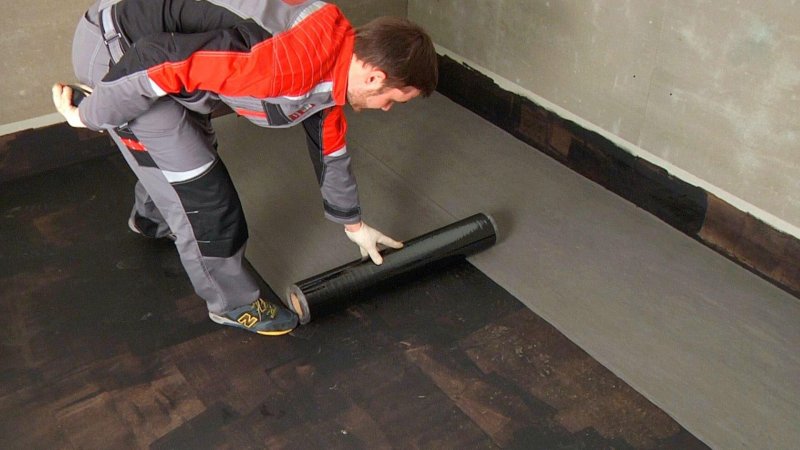 Перед укладкой водоотталкивающего материала устраняют сколы и трещины, затирают выбоины цементным раствором. Теперь поверхность обрабатывают битумной эмульсией, проникающими составами. Рулонные материалы раскатывают по полу с заходом на стены и друг на друга в 15 см. После полной подготовки чаши для стяжки остатки материала срезают.