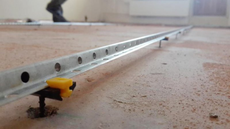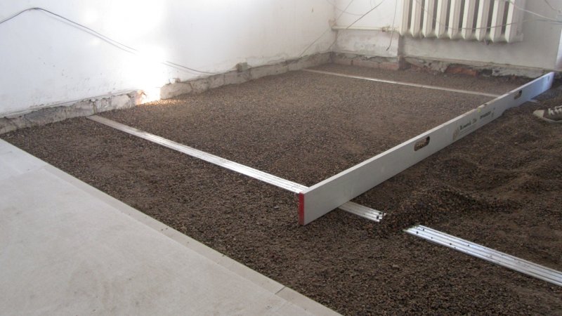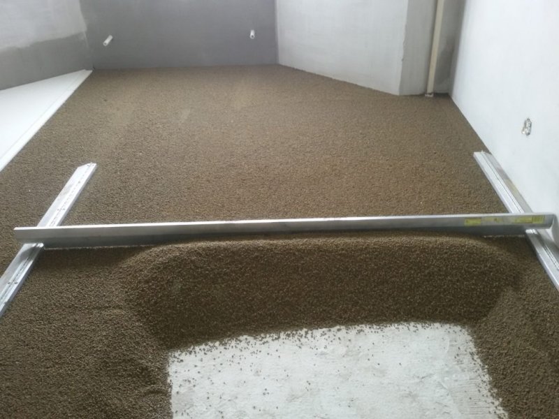 В качестве маяков можно использовать обычный профиль для гипсокартона. Два элемента помещают на засыпку и ровняют по уровню. Когда один участок станет ровным, маяки вынимают и переставляют. Сухую смесь высыпают с запасом, при необходимости трамбуют штукатурной теркой.