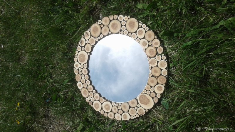 Теперь можно переходить к декорированию. Окрашиваем отмеченную часть по краю окружности в подходящий к интерьеру цвет и наклеиваем спилы. Обрамление будет смотреться эффектней, если комбинировать разные по размеру элементы. Когда композиция подсохнет, намазываем внутреннее поле жидкими гвоздями и приклеиваем зеркало.