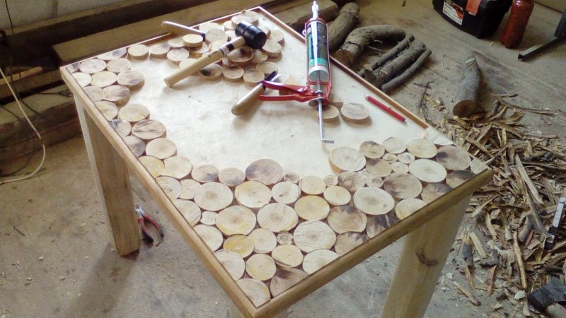 Начинаем работы с подготовки материала – убираем кору, устраняем неровности, очищаем металлической щеткой и шлифовальной машинкой срез. Этот этап напрямую влияет на качество будущего изделия. С помощью мебельных шурупов создаем несущую часть и скрепляем все составные клеем. Если есть поры или сколы, их надо заполнить эпоксидной смолой и устранить. Затем по краям поверхности устанавливаем бортики, заливаем ее смолой и оставляем сохнуть. Спустя несколько дней лишние детали удаляем и шлифуем поверхность стола из спила.