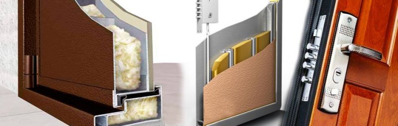 Начинка дверного «пирога» состоит из теплоизоляционных и звукоизоляционных материалов и отличается в зависимости от ценовой категории товара. Дешевые образцы заполняют гофрокартоном или минеральной ватой в виде прессованных плит. Более дорогие модели утепляют с помощью пенополиуретана, который блокирует шумы и не позволяет промерзать помещению.