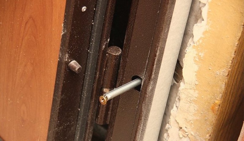 Наиболее надежные конструкции получаются, если вместо петель дверь оснащают специальными противосъемными штырями. Толстые стержни из стали устанавливают на торцевую сторону полотна в то место где обычно располагаются петли. При закрывании двери штыри заезжают в отверстия, образованные в дверной коробке. Стержни оказываются заблокированными, благодаря чему возможность снятия полотна полностью исключается. Таких деталей может быть как минимум 2, однако для большей надежности и устойчивости конструкции рекомендуется устанавливать не менее 5 штук.